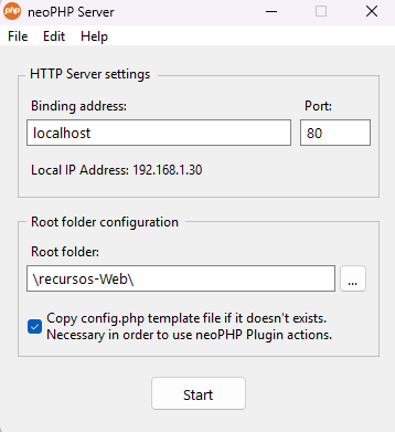 The neoPHP Server tool allows you to quickly set up a local HTTP server to host VisualNEO Web applications that utilize the neoPHP Plugin. This is particularly useful for testing and deploying server-side features, such as handling database interactions, file uploads, and other dynamic operations, without needing a full web server environment.